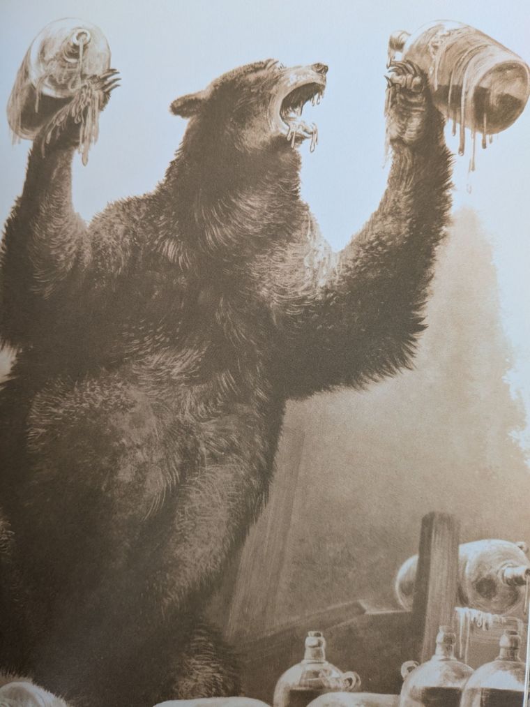 Side note: if you ever drive through the midwest and want to see a National Treasure, there’s a small-town library, home of a large chainsaw-carved bear reading this very book and grinning (carved by my dad). “Better a bear in the orchard, than an Orchard in a bear.” –Johnny’s grandpa