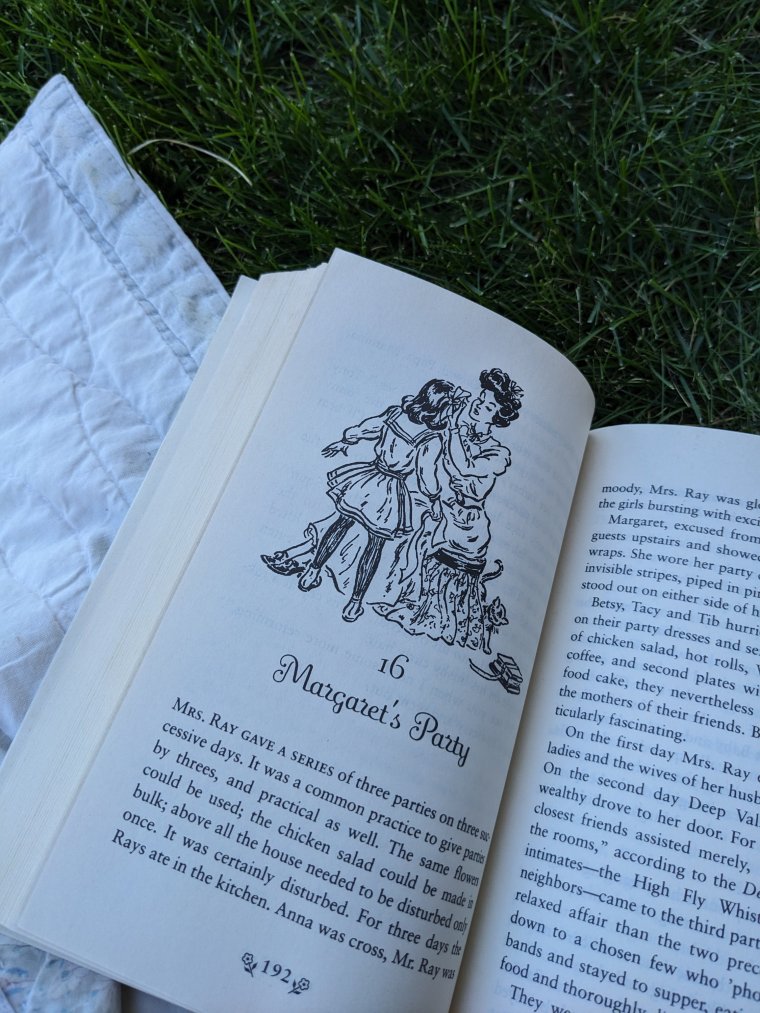 I enjoyed this book more than the other times I’ve read it, perhaps because I’m married now too! Young couple in young America makes me smile and enjoy the authentic history of fashion/economics/etc. woven into the setting. How I wish young couples today could buy their first charming homes besides the lake with only $600 down. I think married Tacy and married Betsy are the best versions of themselves, and I’m relieved Betsy doesn’t chase another immaturity that leads to more heartbreak. Joe brings out the best in Betsy, and Harry brings out the best in Tacy. The young wives turn their energies toward homemaking, hospitality, writing, and babies . . . and trying to marry off the third in their trio, Tib!